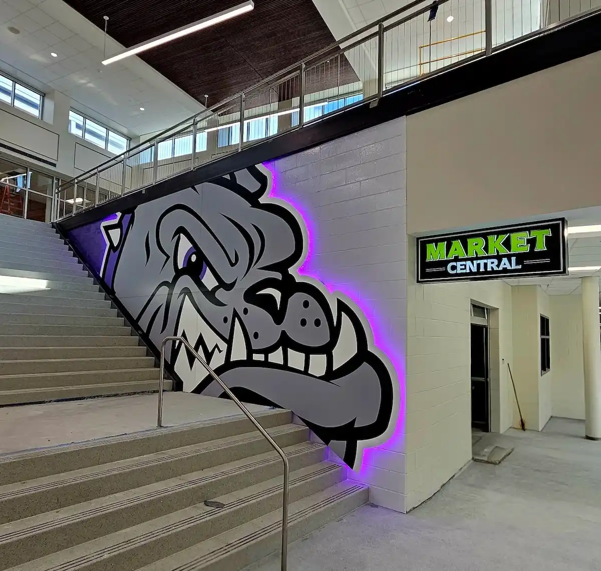 We offer signage solutions for both indoor and outdoor areas of your campus. Our exterior signs are built with materials that withstand weather and prolonged sun exposure, from entrance signage to athletic field markers. Indoors, we provide dimensional lettering, wall displays, and directional signage designed to comply with ADA standards. We also offer full cafeteria and auditorium wall graphics that bring large spaces to life.